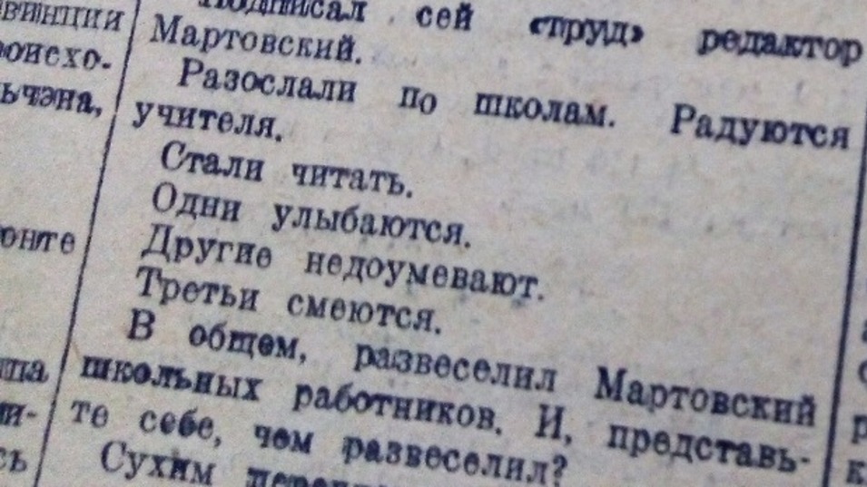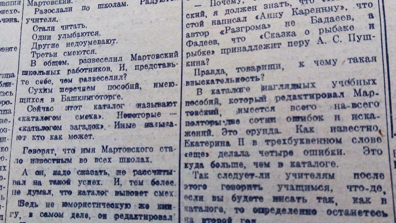 Однако сухой перечень пособий, имеющихся в Башкниготорге, очень развеселил учителей. «Сейчас этот каталог называют «каталогом смеха». Некоторые - «каталогом загадок». Имя Мартовского стало известным во всех школах», - уточняется в газете. Как выяснилось, выпущенный каталог стал «сборником опечаток, безграмотности и редакторской безответственности».