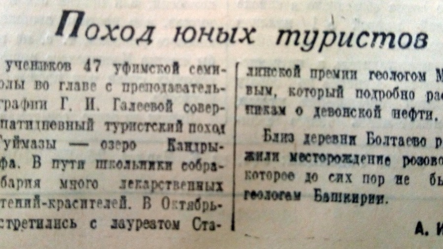 «Группа учеников 47-й уфимской семилетней школы во главе с преподавательницей географии Г. И. Галеевой совершила двадцатидневный туристский поход Уфа - Туймазы - Кандры-куль - Уфа», - говорится в издании. В пути школьники собрали много лекарственных трав и растений-красителей. В Октябрьском туристы встретились с лауреатом Сталинской премии геологом Мальцевым, который рассказал ученикам о девонской нефти.