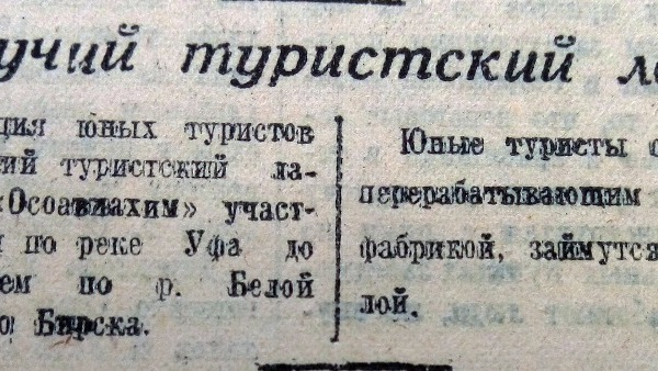 В августе 1947 года Башкирская станция юных туристов организовала плавучий туристский лагерь. «На пароходе «Осоавиахим» участники поднимутся по реке Уфа до Красного Ключа, затем по реке Белой совершат плавание до Бирска», - информировала газета. Целью «плавучего похода» школьников было знакомство с нефтеперерабатывающим заводом, бумажной фабрикой, а также изучение реки Белой.
