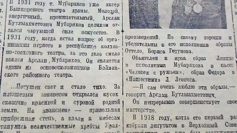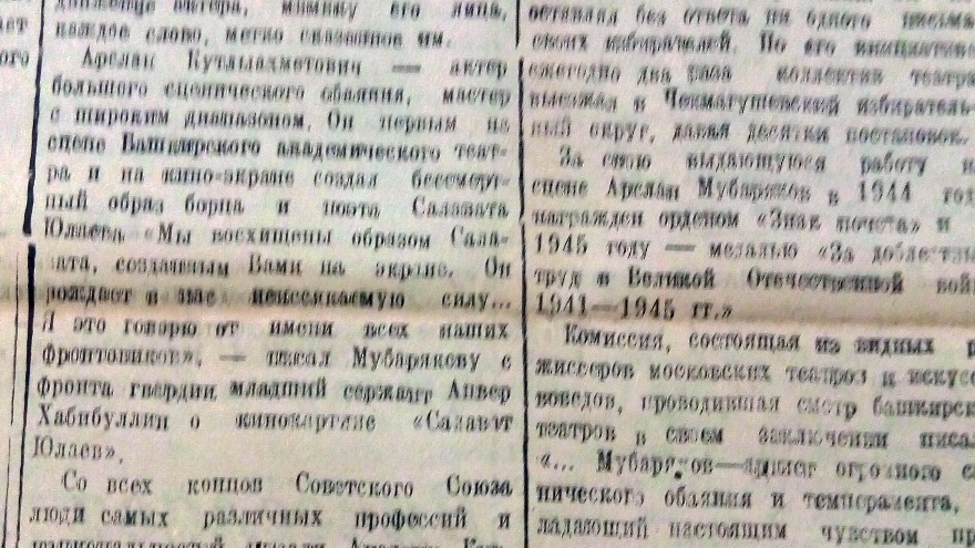 Справка. Арслан Мубаряков родился в 1908 году в деревне Асина Оренбургской губернии, ныне это село Ассы Белорецкого района республики. Он рано лишился родителей и воспитывался в Серменевском детском доме. В 1931 году окончил Башкирский техникум искусств. С 1934 года и до конца жизни Арслан Мубаряков работал актером Башкирского академического театра драмы. Образ Салавата Юлаева стал одним из самых ярких достижений мастера. В том числе в знаменитом фильме Якова Протазанова «Салават Юлаев». Картина снималась в канун Великой Отечественной. Во время войны фильм часто показывали в сражающихся частях, поднимая боевой дух солдат. В 1955 году Мубарякову было присвоено звание народного артиста СССР. Арслан Мубаряков умер в 1977 году. Его дочь Гюлли Мубарякова - известная актриса театра и кино, режиссер, народная артистка СССР.