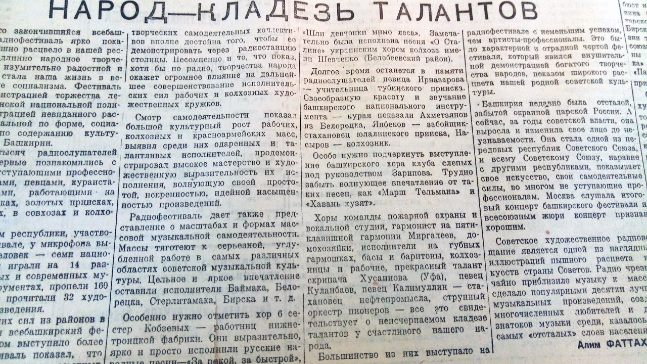 «Хор команды пожарной охраны, гармонист на пятиклавишной гармони Миргалеев, домохозяйки, исполнители на губной гармошке, басы и баритоны, колхозники и рабочие, прекрасный талант скрипача Хусаинова, певец Калимуллин, стахановец нефтепромысла - все это свидетельствует о неисчерпаемом кладезе талантов у народа», - отмечается в газете. Участники не уступали в мастерстве артистам-профессионалам. Итоговый концерт башкирского радиофестиваля слушали в Москве.