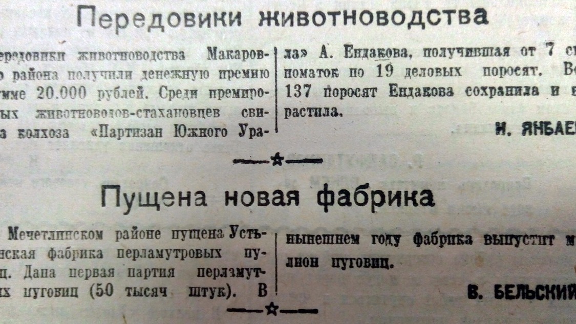 Весной 1947 года в Мечетлинском районе Башкирии заработала новая фабрика. Усть-Икинская фабрика специализировалась на выпуске востребованных в то время перламутровых пуговиц. «Дана первая партия перламутровых пуговиц, 50 тысяч штук, - говорится в газете. - В нынешнем году фабрика выпустит миллион пуговиц».