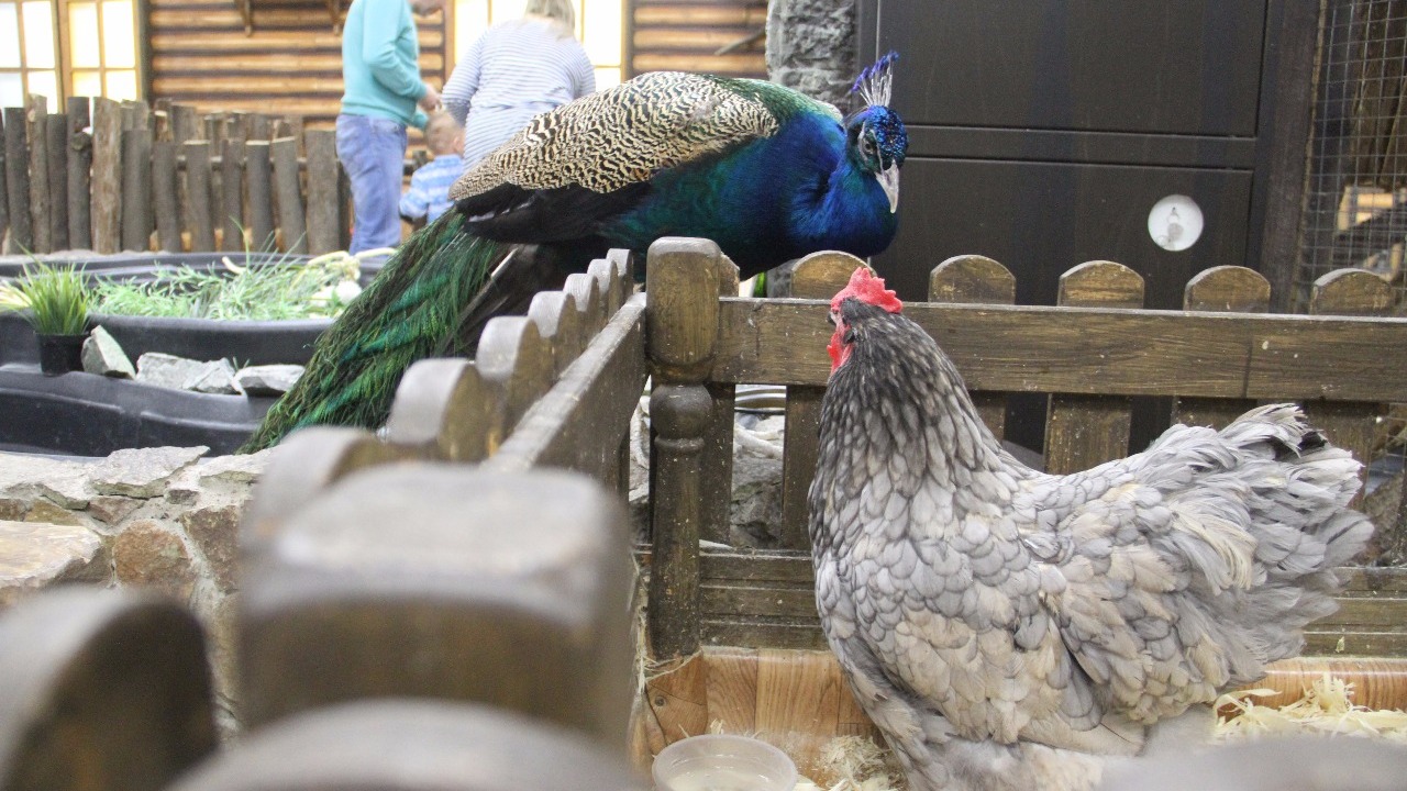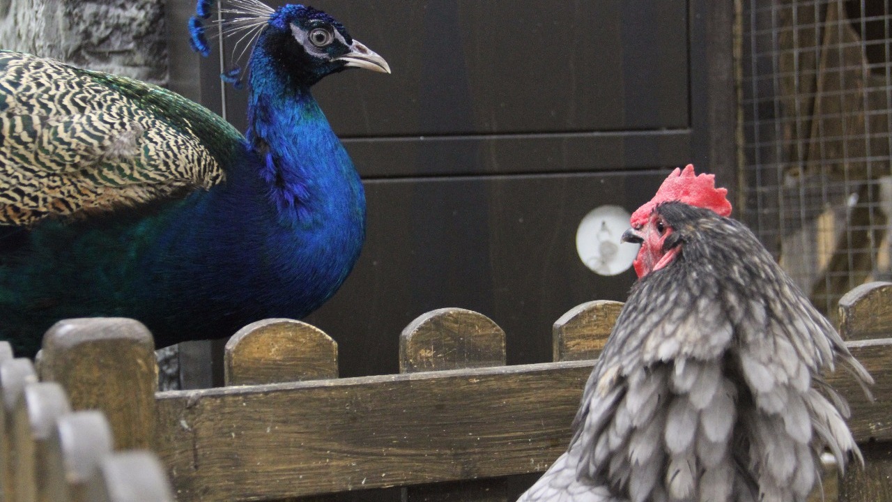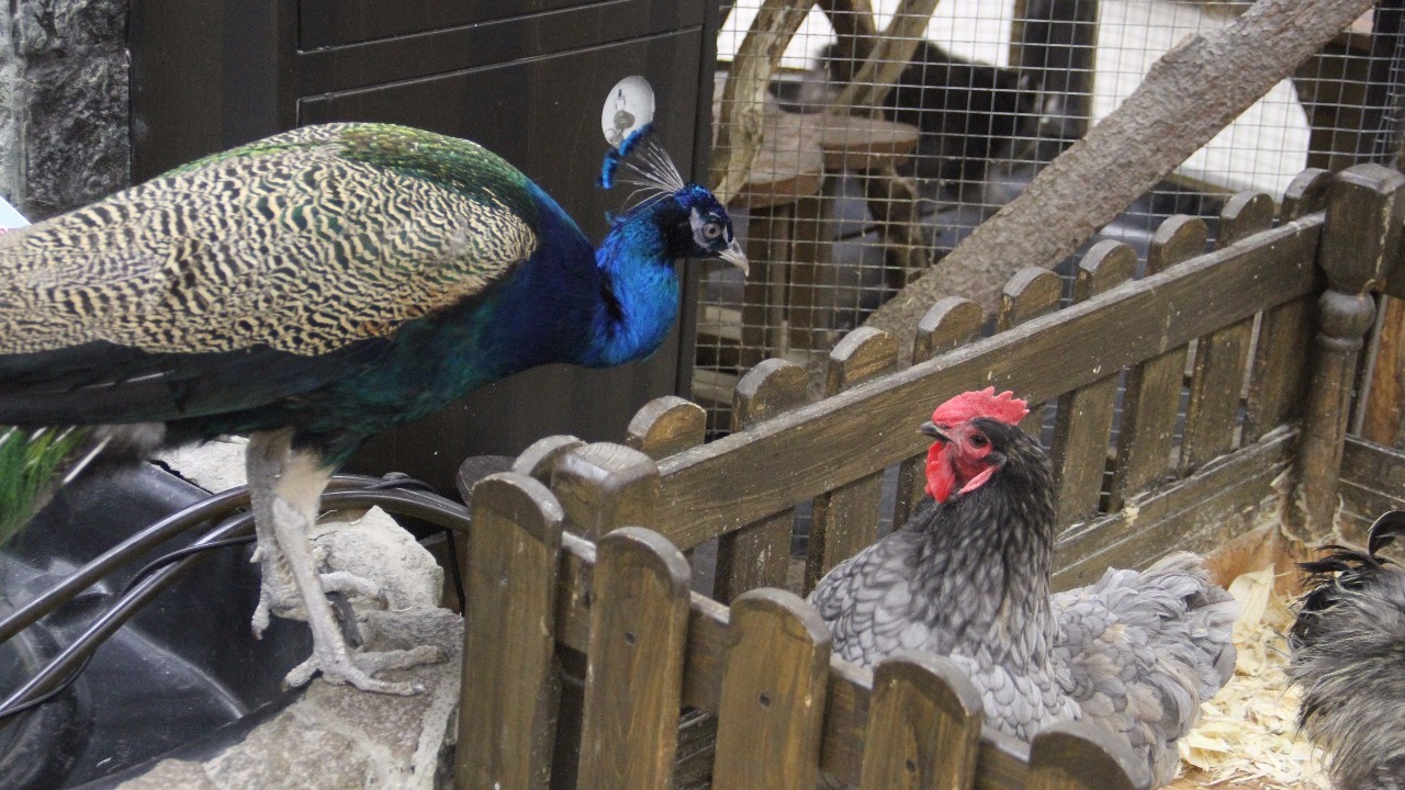 В контактном зоопарке Уфы петух и павлин борются за внимание курочки