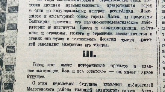 Город имеет историческое прошлое и славное настоящее. Как и все советское - он имеет яркое будущее, уверены в издании. В начале 1947 года с недалеким будущим города его жителей познакомил главный архитектор Уфы Александр Осятинский. По проекту, город украсят грандиозные дворцы и площади, прекрасные бульвары и парки. Тогда же горожанам был представлен проект будущей площади имени Сталина.