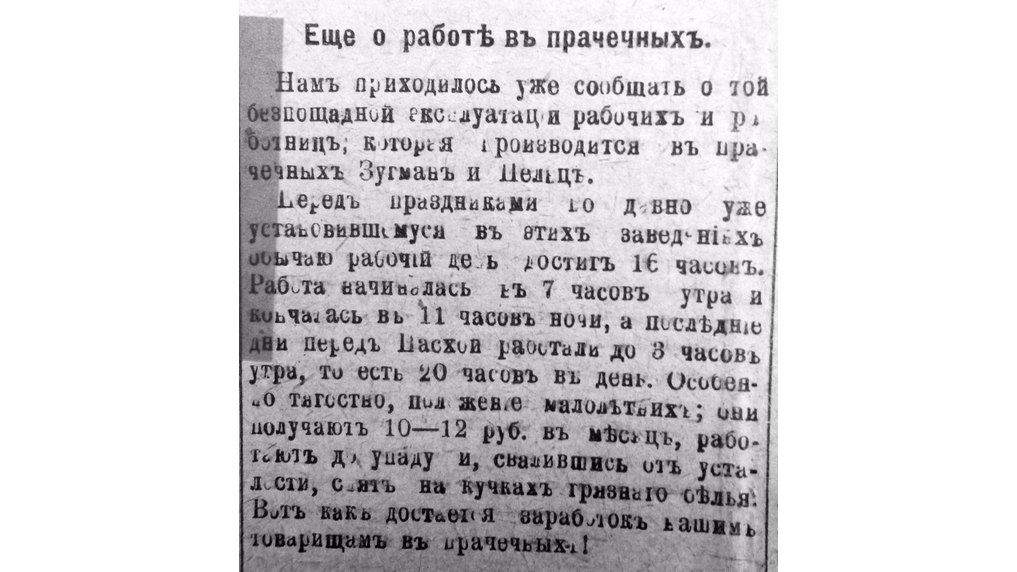 Ранее газета «Вперед!» рассказала о «беспощадной эксплуатации рабочих и работниц, которая производится в прачечных Зугман и Пелец». Перед праздниками по давно уже установившемуся в этих заведениях обычаю рабочий день достигал 16 часов. Работа начиналась в семь утра и кончалась лишь в одиннадцать ночи. А последние дни перед Пасхой трудились и вовсе до трех часов ночи, то есть по 20 часов в день. Особенно тягостное положение было у малолетних. «Они получают 10-12 рублей в месяц, работают до упаду и, свалившись от усталости, спят на кучках грязного белья, - выяснило издание. - Вот так достается заработок нашим товарищам в прачечных!»