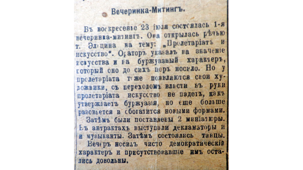 «В воскресенье 23 июля состоялась первая вечеринка-митинг. Она открылась речью товарища Эльцина на тему «Пролетариат и искусство», - сообщило издание уфимских социал-демократов. Выступая перед собравшимися, оратор обратил внимание на то, что искусство до сих пор носило буржуазный характер. «Но у пролетариата тоже появляются свои художники, с переходом власти в руки пролетариата искусство не падет, как утверждает буржуазия, но еще больше разовьется и обогатится новыми формами», - считают в газете.
