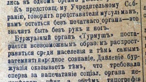 «К предстоящему Учредительному собранию нам остаться без печатного органа - это значит быть без рук и ног», - жаловались исполкому представители мусульман. Они были уверены, что «буржуазный орган «Турмушъ» постарается всевозможным образом распространиться среди населения и тем самым затемнить народное сознание».
