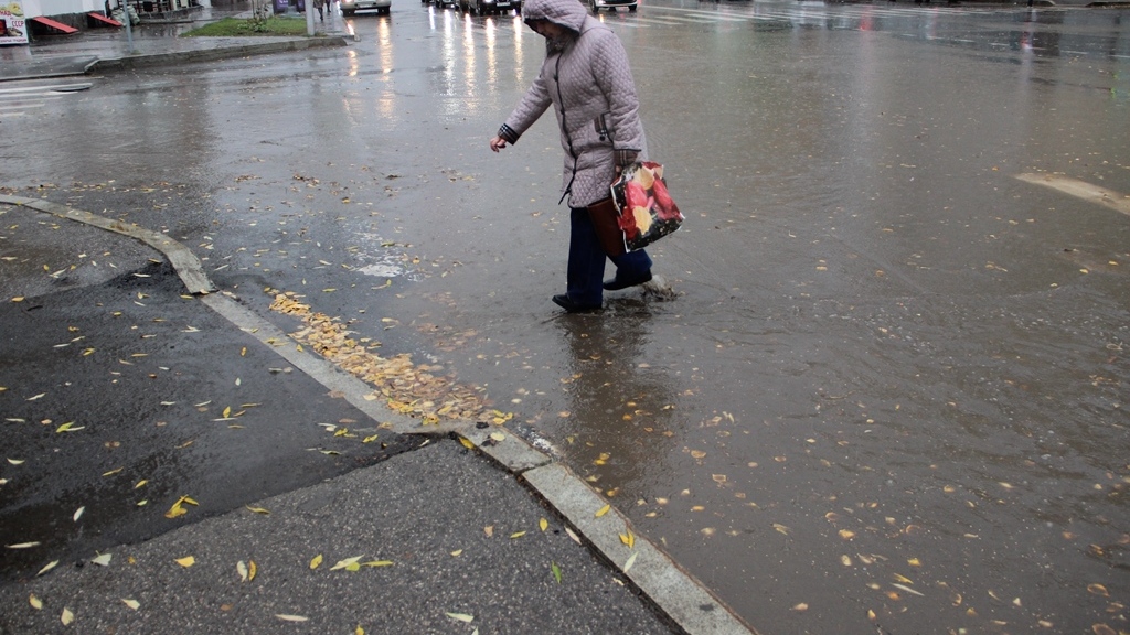 УФА, 19 окт 2017. /ИА «Башинформ», Ксения Калинина/. На столицу Башкирии днем 19 октября обрушился мощный ливень с градом. Дождь то прекращался, то лил с удвоенной силой, перемежаясь с мелким градом. В центре города, на пересечении улиц Кирова и Пархоменко, потоками воды затопило проезжую часть. Горожане искали способы перейти дорогу так, чтобы окончательно не вымокнуть. Уфимцы искали спасение под козырьками зданий, прятались на остановках. Хватило нескольких минут, чтобы вымокнуть до нитки. Через час город озарило солнце, как будто дождя и не было.