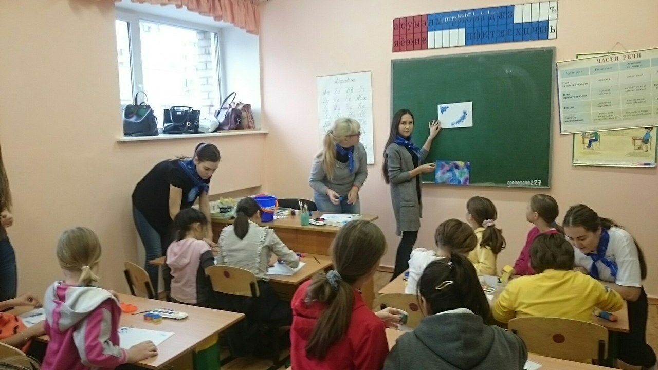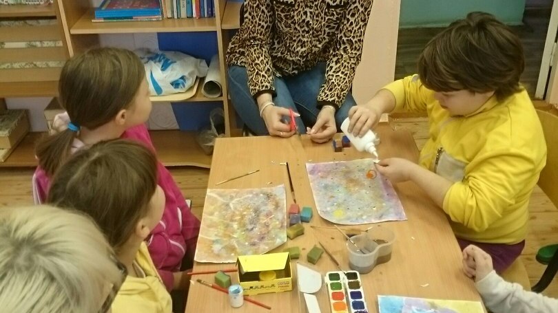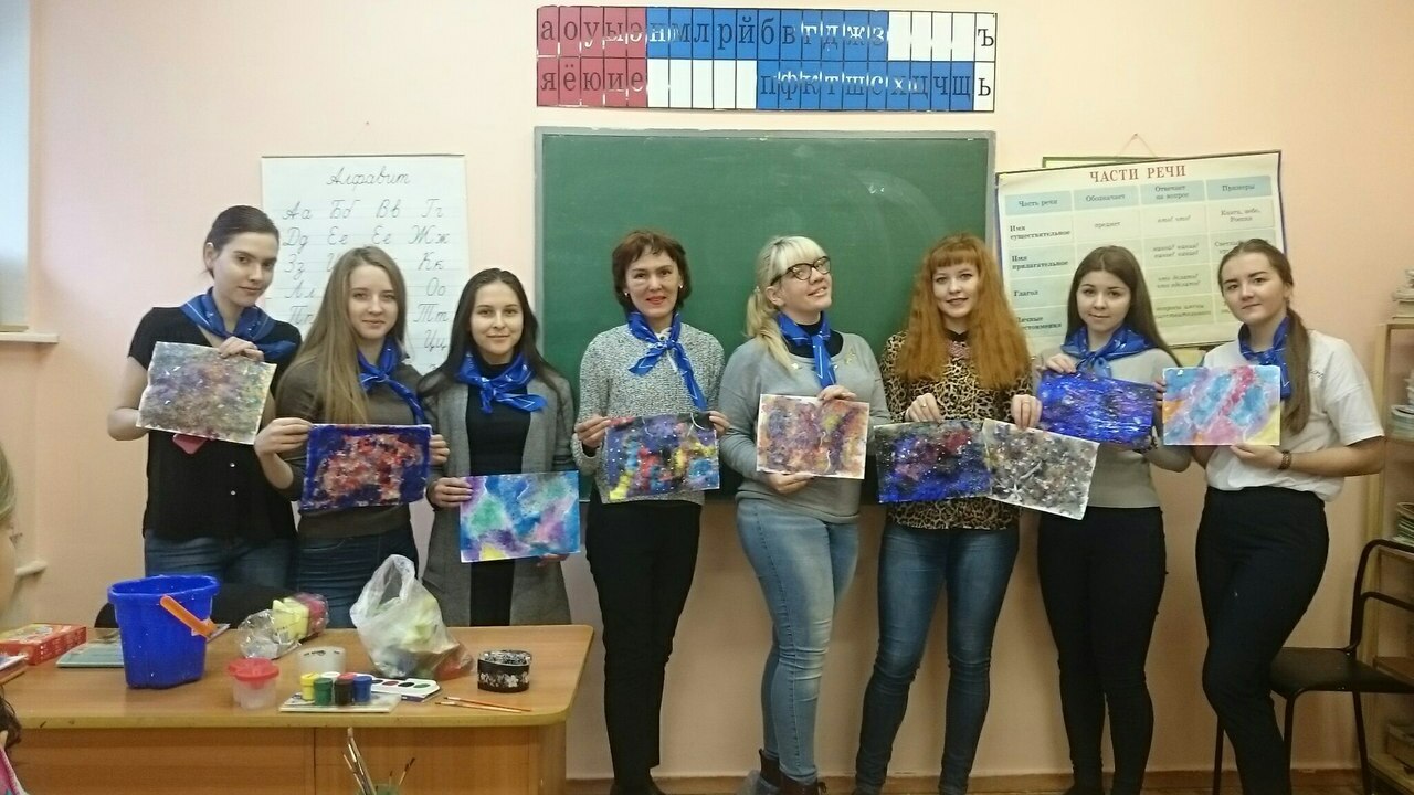 Ведущими урока Ириной Хисматуллиной и Ангелиной Козыревой была озвучена тема и показана необычная техника работы с гуашью и обыкновенной солью. Работы получились неожиданные, интересные и творческие.