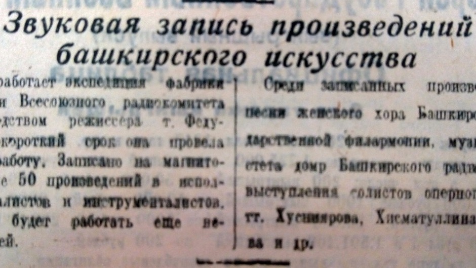 «В Уфе работает экспедиция фабрики звукозаписи Всесоюзного радиокомитета под руководством режиссера Федулова», - говорится в газете. За короткий срок своего пребывания экспедиция провела здесь большую работу. На магнитную ленту было записано свыше 50 произведений в исполнении вокалистов и инструменталистов республики.