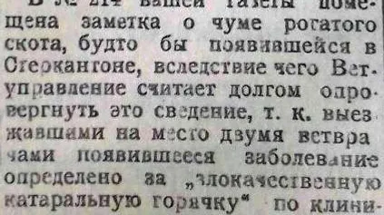 «В №214 вашей газеты помещена заметка о чуме рогатого скота, будто бы появившейся в Стерлитамакском кантоне, - обратился к читателям издания руководитель ветеринарного управления республики. - Ветуправление считает своим долгом опровергнуть эти сведения».