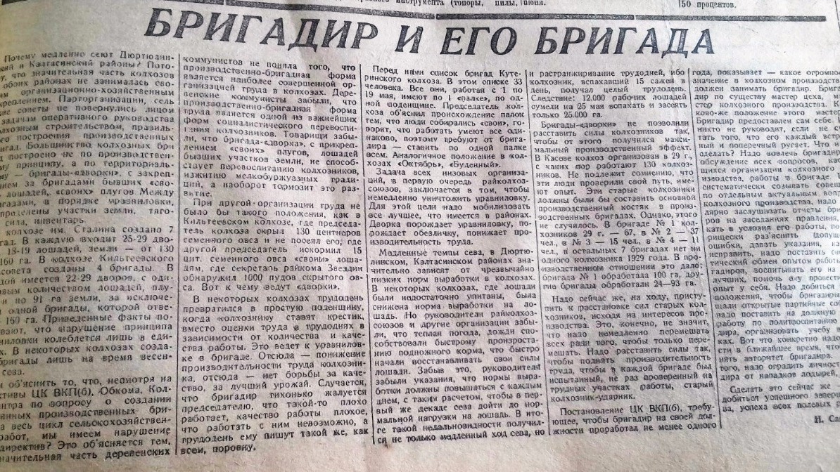 «Почему медленно сеют Дюртюлинский и Калтасинский районы? Потому что значительная часть колхозов в обоих районах не занималась своим организационно-хозяйственным укреплением», - сообщили в газете и призвали немедленно заняться правильным построением производственных бригад. Дело было в том, что «большинство колхозных бригад построено не по производственному принципу, а по территориальному - бригады-«дворки», с закреплением за бригадами бывших «своих» лошадей, плугов». Между бригадами равномерно распределялись участки земли, тягловая сила и инвентарь.