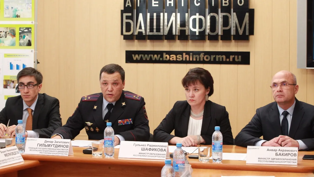 УФА, 16 ноя 2017. /ИА «Башинформ», Ксения Калинина/. В Уфе, в агентстве «Башинформ», 16 ноября состоялась пресс-конференция по случаю Всемирного дня памяти жертв ДТП, который отмечается каждое третье воскресенье ноября. В мероприятии приняли участие главный госавтоинспектор РБ Динар Гильмутдинов, министр здравоохранения РБ Анвар Бакиров, министр образования РБ Гульназ Шафикова, руководитель Агентства по печати и СМИ РБ Борис Мелкоедов, председатель Госкомитета республики по транспорту и дорожному хозяйству Тимур Мухаметьянов, представители духовенства, общественных организаций и журналисты.