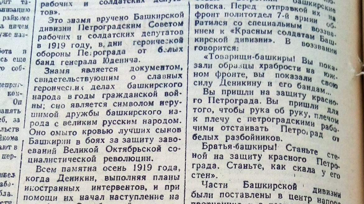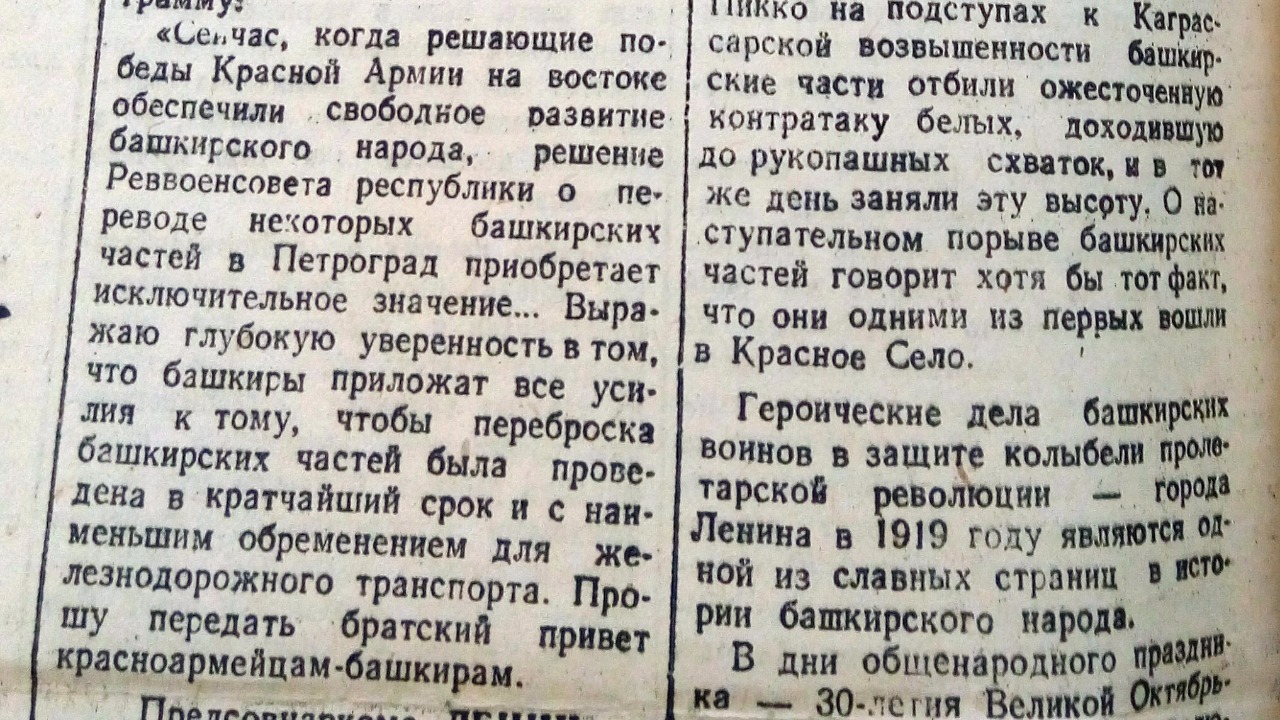 В газете отмечается, что «героические дела башкирских воинов в защите колыбели пролетарской революции - города Ленина в 1919 году являются одной из славных страниц в истории башкирского народа».