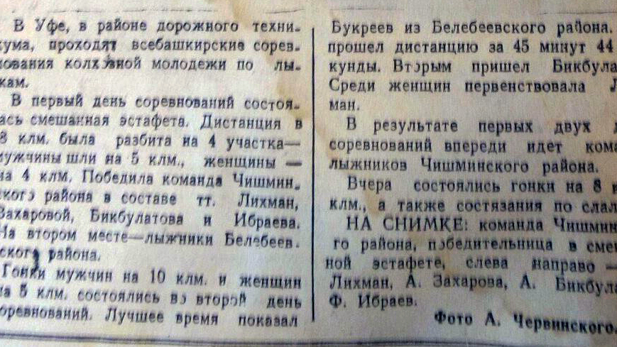 В этом же номере газета рассказывает о всебашкирских соревнованиях колхозной молодежи по лыжам, проходивших в Уфе. Сельские районы республики соревновались в мужской и женской эстафете, гонке преследования. Лучшее время в гонке на 10 км показал лыжник из Белебеевского района, прошедший дистанцию за 45 минут 44 секунды, информировало издание. В командном зачете впереди были лыжники Чишминского района.