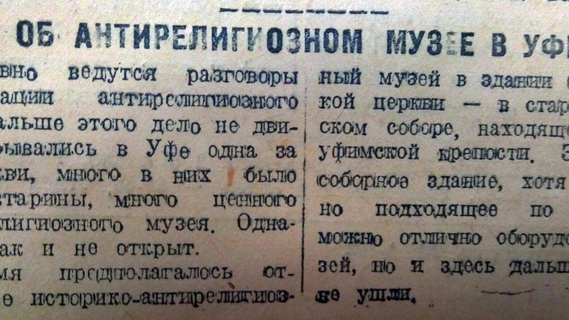 «В Уфе давно ведутся разговоры об организации антирелигиозного музея, но дальше этого дело не двигается», - констатировали в газете. Закрывались в городе одна за другой церкви, много в них было церковной старины, много ценного для антирелигиозного музея. Однако музей так и не был открыт.