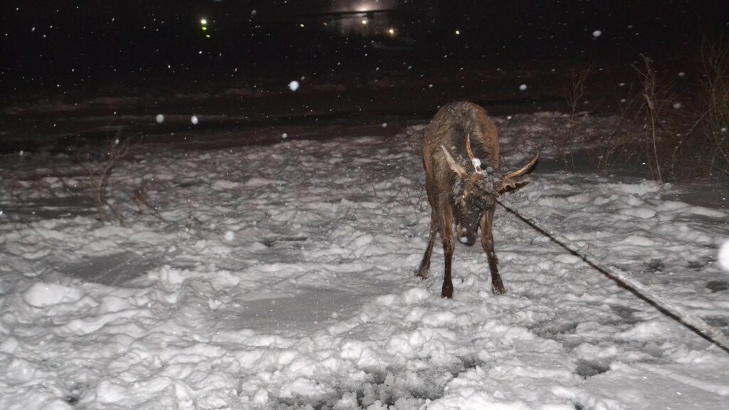 За помощью к спасателям обратился житель поселка Козарез, ставший свидетелем того, как перебиравшийся через реку Белую олень проломил своим весом лед и барахтается в воде, пытаясь выбраться.