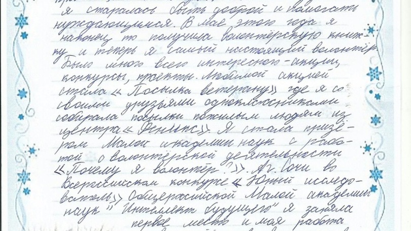Девятилетняя Милана Пяткова прислала необычное письмо в виде поделки: волшебный сундучок, а в нем «ключики добра», каждый из них - доброе дело, которое может сделать любой человек. Девочка с четырех лет является волонтером, они вместе с мамой постоянно навещают подопечных комплексного центра «Феникс», проводят благотворительные ярмарки, собирают для них вещи.