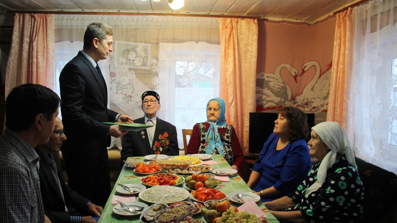 Именинника поздравили родные, близкие, односельчане, а также глава администрации района Ильшат Райманов и председатель районного совета ветеранов Нуриахмет Маннапов. Долгожителю были переданы личное поздравление от президента России Владимира Путина и приветственный адрес с пожеланиями крепкого здоровья, долгих лет жизни и всего самого доброго от главы региона Рустэма Хамитова. Приехавшие гости вручили памятные подарки администрации района.