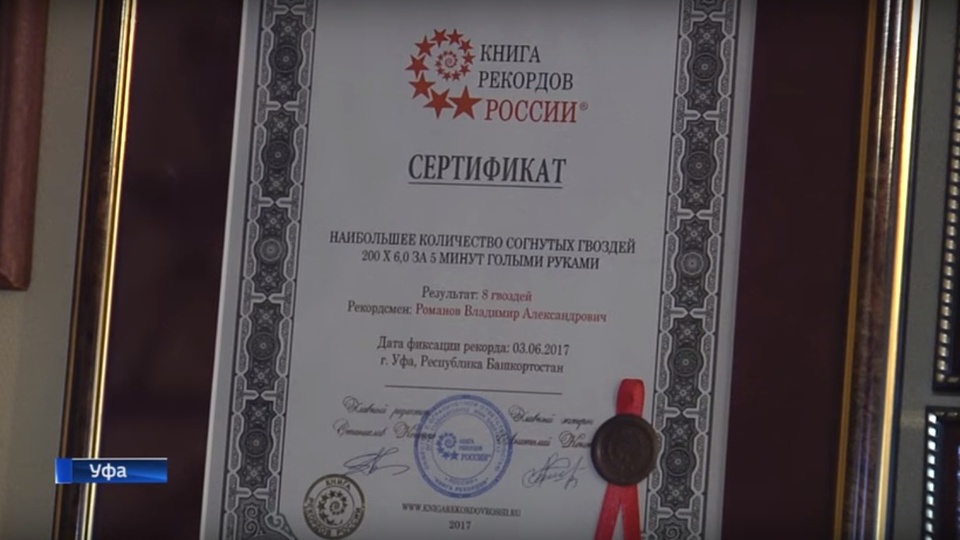 УФА, 11 янв 2018. /ИА «Башинформ», Гульфия Акулова/. Летом 2017 года уфимец Владимир Романов установил рекорд России, согнув голыми руками за пять минут восемь гвоздей. С обладателем необыкновенной богатырской силы встретилась съемочная группа ГТРК «Башкортостан».