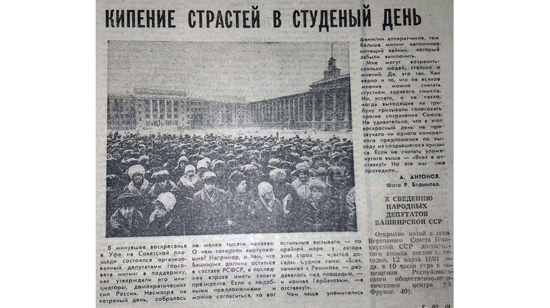 «В минувшее воскресенье в Уфе на Советской площади состоялся организованный депутатами горсовета митинг в поддержку демократических сил России», - сообщила газета 12 марта 1991 года. В этот морозный и ветреный день на городской площади собрались более тысячи человек. О чем же говорили выступающие на митинге? В частности, о том, что «Башкирия должна остаться в составе РСФСР, а последняя вправе иметь своего президента».