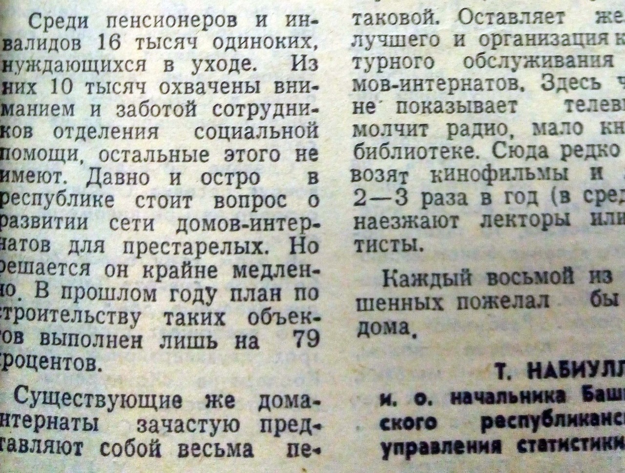 При этом среди пенсионеров и инвалидов было 16 тысяч одиноких, нуждающихся в особом уходе. «Из них 10 тысяч охвачены вниманием и заботой сотрудников отделения социальной помощи, остальные этого не имеют», - констатировал Набиуллин. В республике остро стоял вопрос о развитии сети домов-интернатов для престарелых, но решался он очень медленно. «В прошлом году план по строительству таких объектов выполнен лишь на 79 процентов», - говорится в публикации.