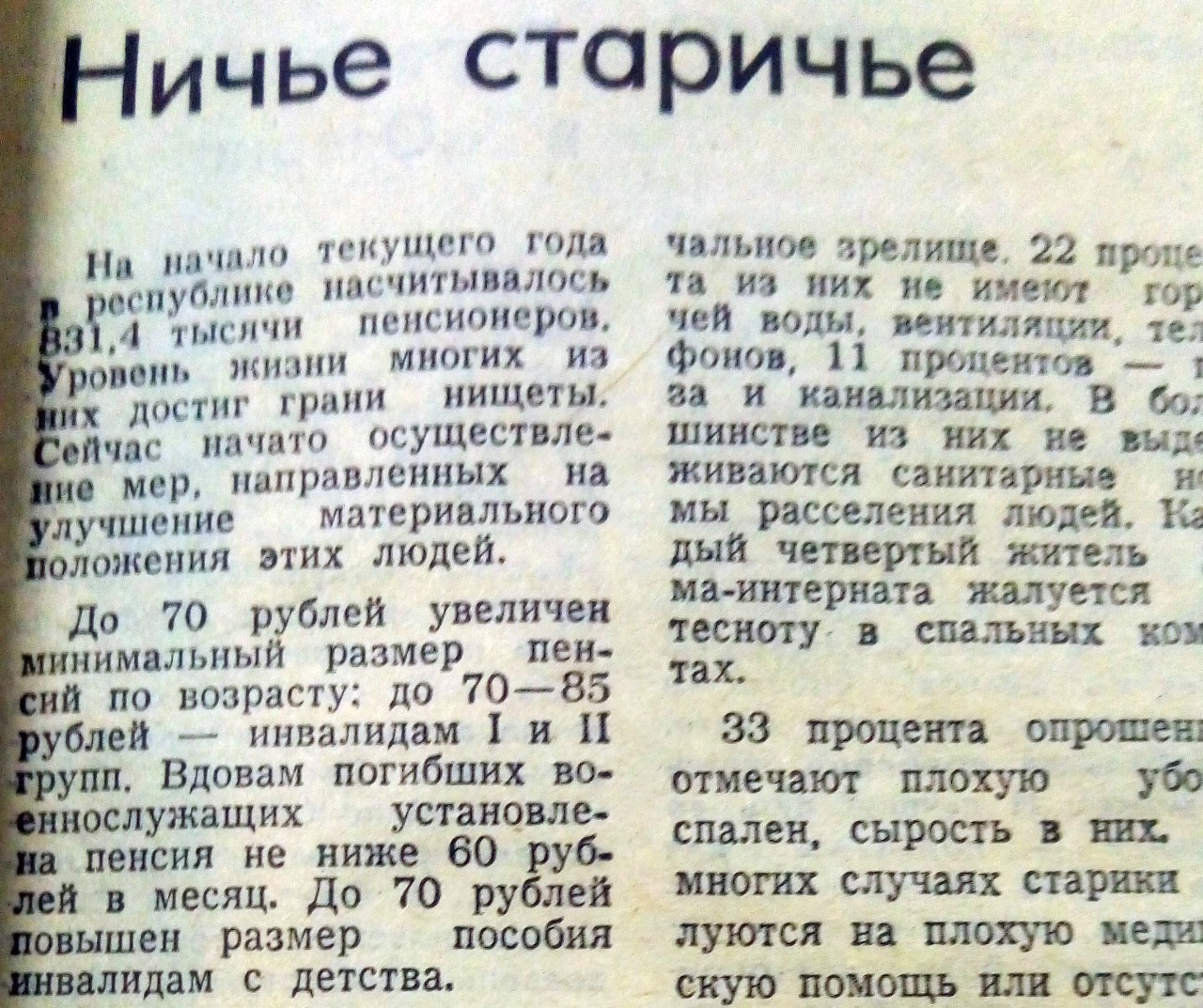 Как лучик надежды сообщение газеты о том, что «начато осуществление мер, направленных на улучшение материального положения этих людей». В частности, до 70 рублей был увеличен минимальный размер пенсии по возрасту и пособия инвалидам с детства, вдовам погибших военнослужащих установили пенсию не ниже 60 рублей.