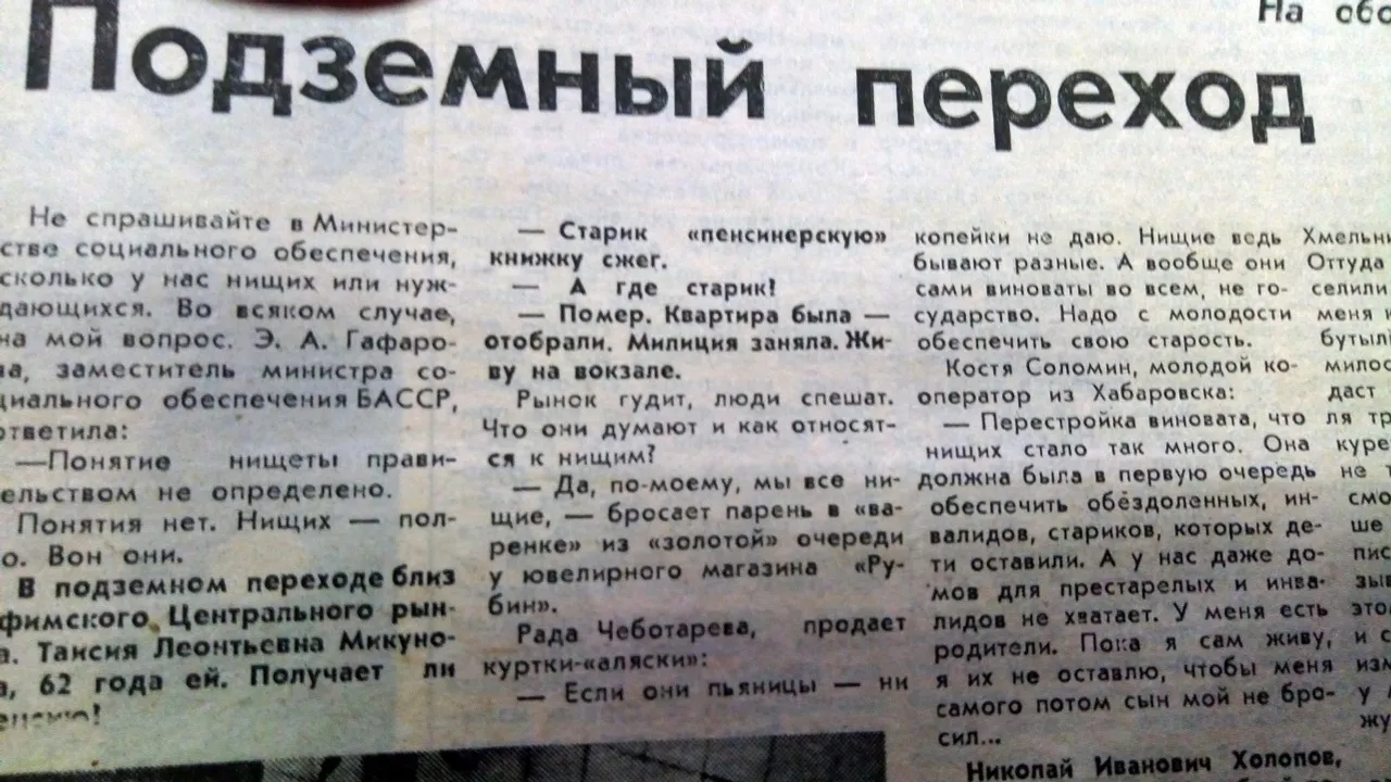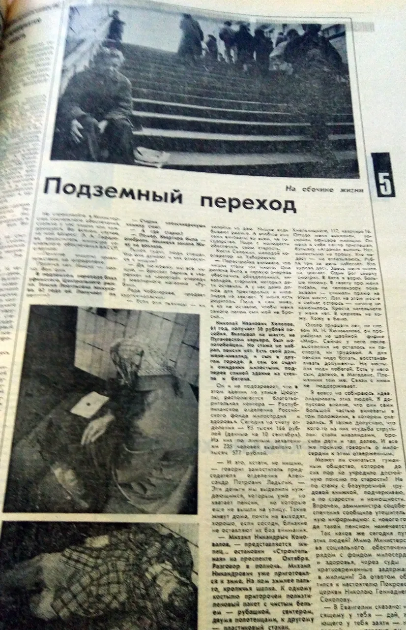 УФА, 25 янв 2018. /ИА «Башинформ», Галина Пантюхина/. Кто они - обитатели уфимских подземных переходов и как они дошли до такой жизни. В непростом вопросе разбиралась газета «Советская Башкирия» в октябре 1990 года. Агентство «Башинформ» продолжает знакомить читателей с материалами из Архива печати республики.