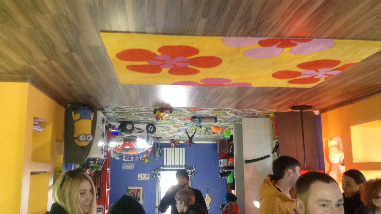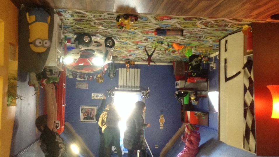 В доме несколько комнат: есть гостиная, кухня, прихожая, детская, рабочий кабинет и санузел - всего около 350 квадратных метров. Наполнение стандартное: на столиках - журналы и книги, в стопке замечена даже «Зулейха открывает глаза» Гузель Яхиной. В детской на «полу» разбросаны игрушки, «стоит» синтезатор. Перевернутый холодильник также полон продуктов, тоже перевернутых. Все детали, по словам строителей, прикреплены современными устройствами крепления, их надежность проверяли весом взрослого мужчины - на тот случай, если посетители всё же захотят это проверить.
