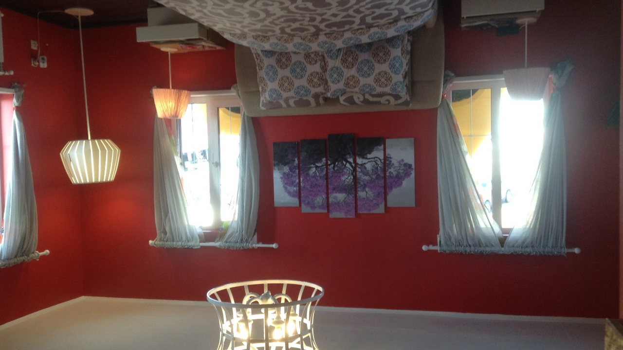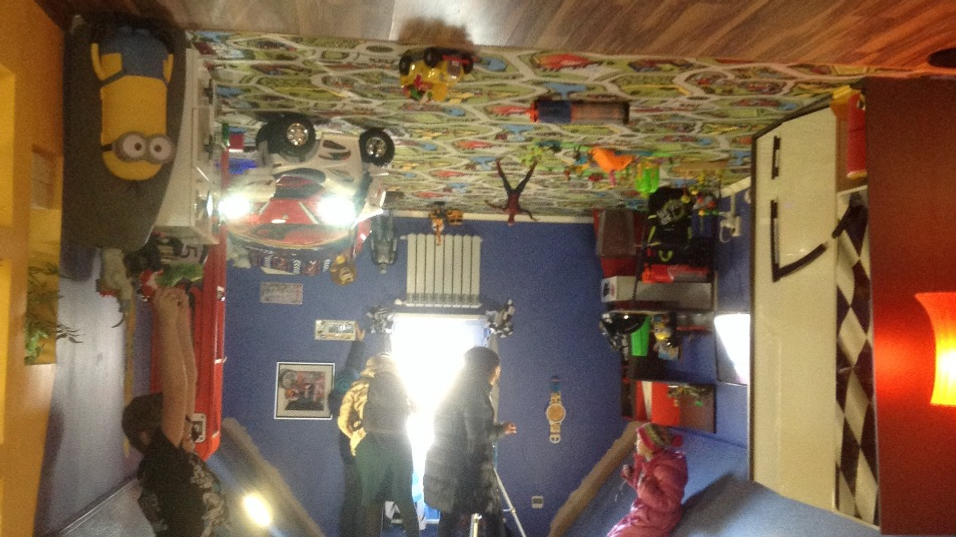 Внутри дома всё соответствует внешнему облику: интерьер дома наверху - и диваны, и шкафы, и столы, и обувь у порога. Внизу - то есть на потолке - только люстра.