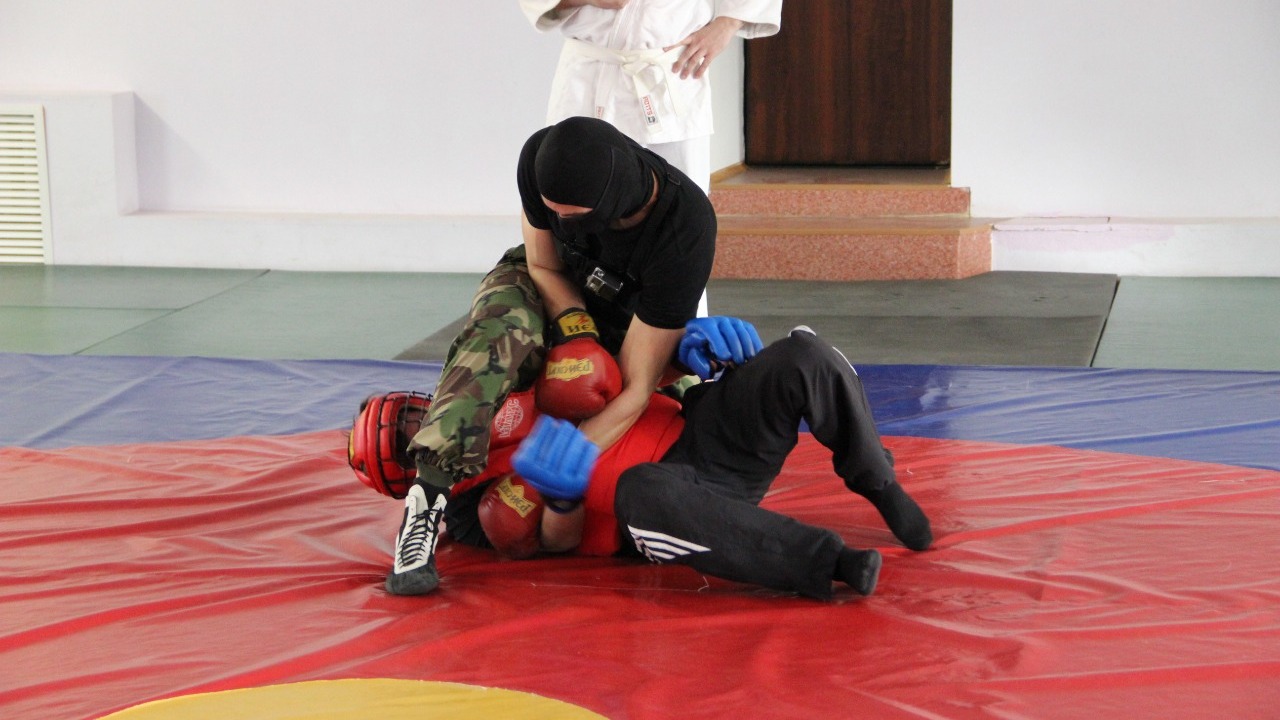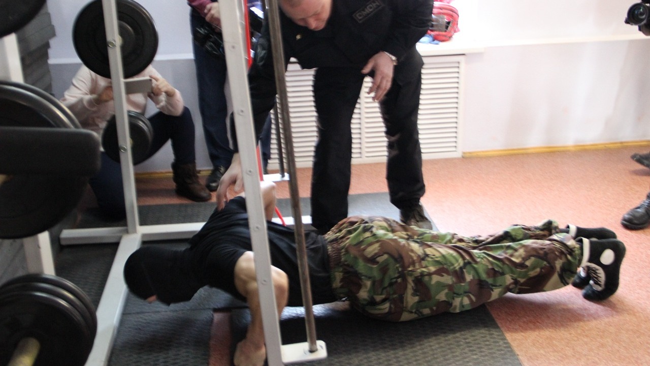 Затем участников ожидал так называемый тест Купера, куда входят подтягивание на перекладине, отжимание, выпрыгивание из приседа и «армейская пружина». После оценки физической подготовки «молодые бойцы» приступили к самой зрелищной части испытаний — рукопашному бою и борьбе (самбо).