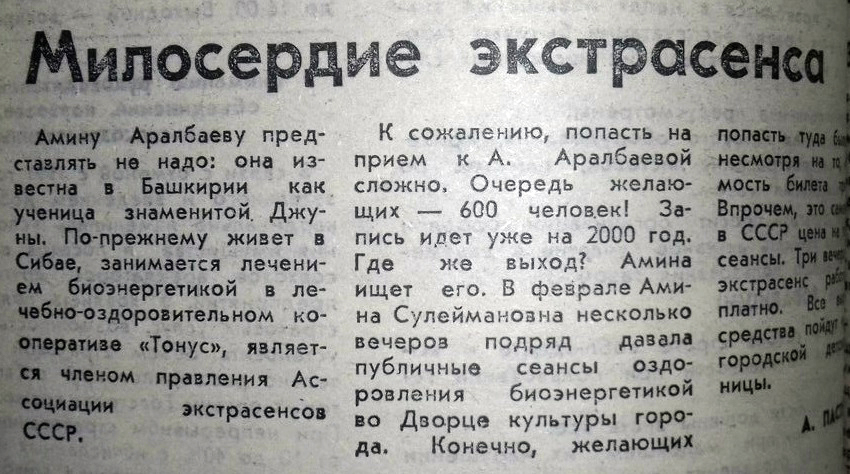 «Амину Аралбаеву представлять не надо: она известна в Башкирии как ученица знаменитой Джуны», - пишет газета 8 марта 1991 года. Жительница Сибая занималась лечением биоэнергетикой, являлась членом правления Ассоциации экстрасенсов СССР.