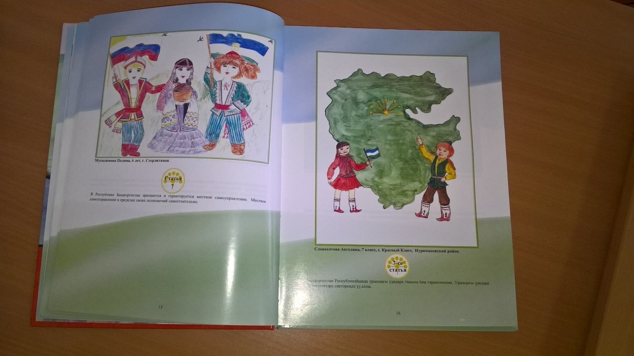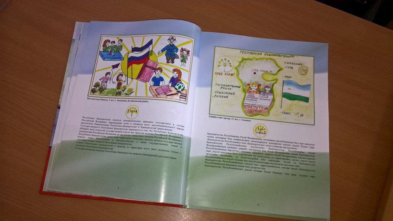 Иллюстрированная детская версия Основного закона республики подготовлена по итогам конкурса детского рисунка, который проводился Конституционным судом РБ в начале 2016-го учебного года. Собрана целая «конституционная галерея» - 212 рисунков (на 180 страницах), иллюстрирующих девять глав и более 80 статей Конституции РБ. Каждая из статей представлена на двух государственных языках республики: русском и башкирском.