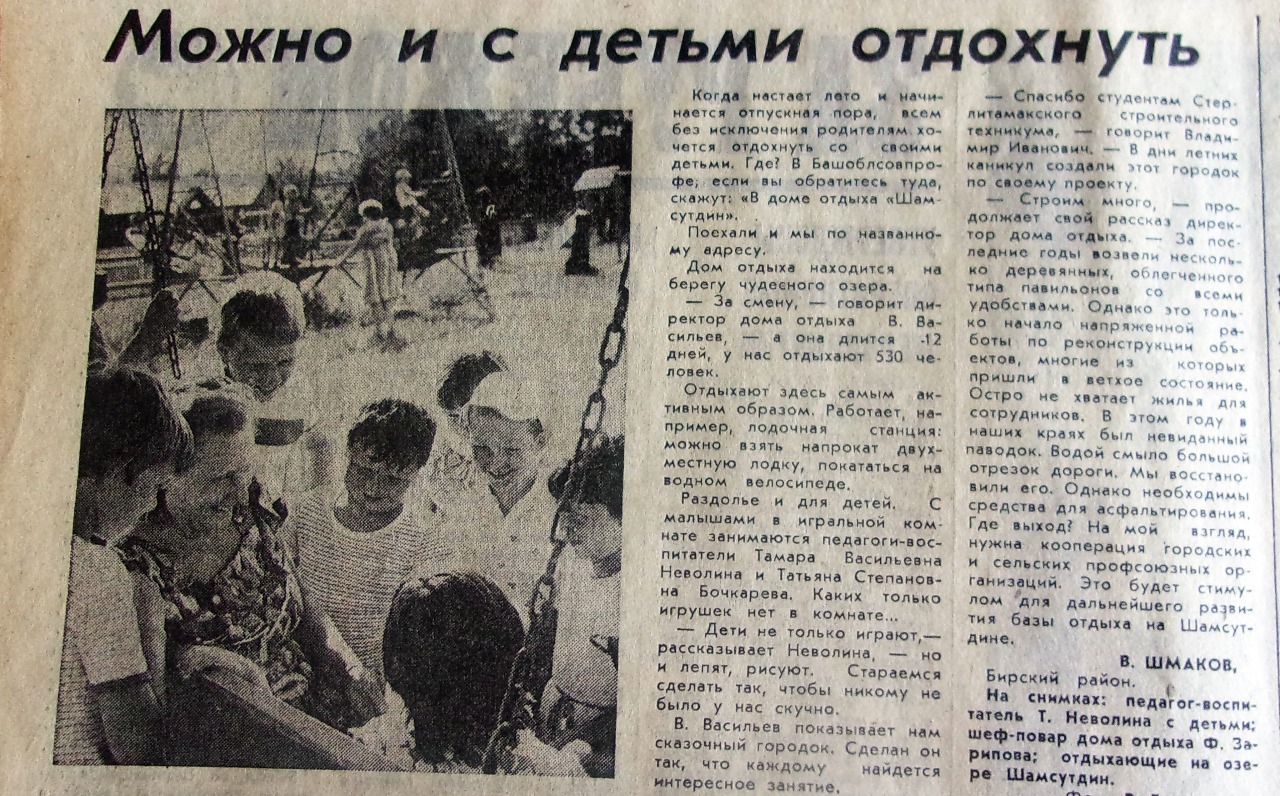 «Когда настает лето и начинается отпускная пора, всем без исключения родителям хочется отдохнуть со своими детьми. Где? В доме отдыха «Шамсутдин». На берегу чудесного озера», - уверяют в газете. Именно это место для летнего времяпрепровождения родителей с детьми было рекомендовано областным советом профсоюзов. Как сообщил изданию директор дома отдыха, за одну смену, которая длилась 12 дней, здесь активно проводили время 530 человек. В доме отдыха работала лодочная станция. «Можно взять напрокат двухместную лодку, покататься на водном велосипеде», - предложили в газете.