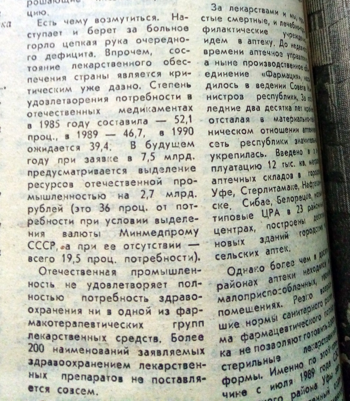 Отрицательно сказалось на фармацевтической промышленности повальное закрытие химических предприятий страны, производящих сырье для лекарств. На повестке дня было и закрытие уфимского «Химпрома», единственного в Союзе производителя хлорсульфоновой кислоты, так необходимой при изготовлении лекарств. В издании уверены, «закрытие подобных производств - не выход из положения, нужно идти по пути создания экологически чистого производства».