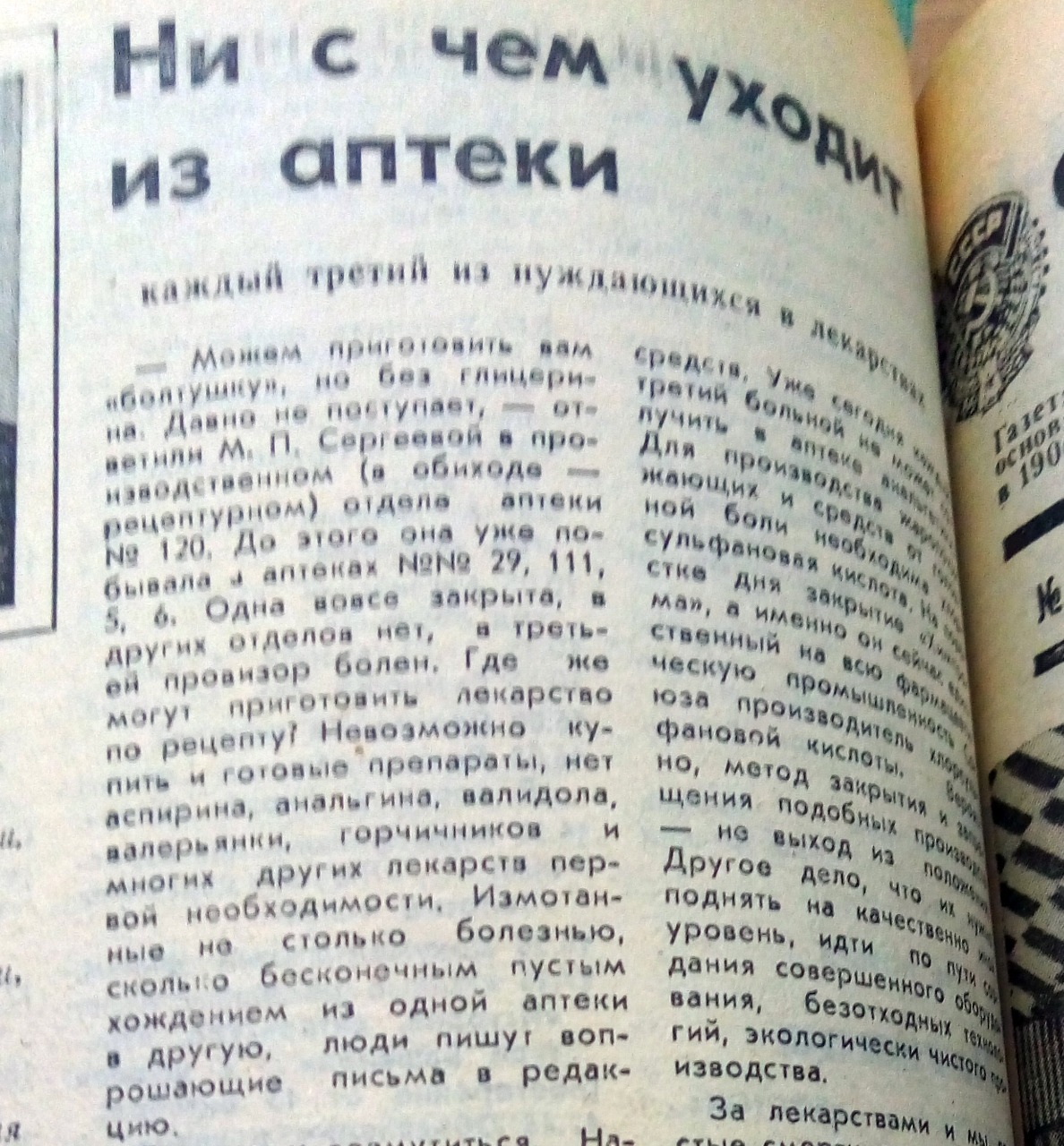 УФА, 28 мар 2018. /ИА «Башинформ», Галина Пантюхина/. Почему в республике каждый третий нуждающийся в лекарствах уходил из аптеки ни с чем, из-за чего увеличился спрос на корвалол и куда делась валерьянка. В «аптечных» проблемах разбиралась газета «Советская Башкирия» в ноябре 1990 года. Агентство «Башинформ» продолжает знакомить читателей с материалами из Архива печати республики.