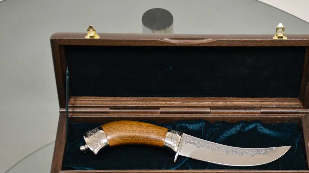 «Батыр» относится к категории разделочных ножей. Он не является холодным оружием и не требует разрешения на приобретение и хранение. Поэтому нож станет великолепным подарком - особенно если преподнести его в музыкальной шкатулке. Деревянные ларцы из вяза изготавливают в Бирске. Музыкальное сопровождение может быть любым - по желанию заказчика.
