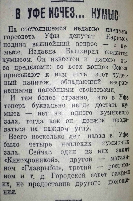 «На состоявшемся недавно пленуме горсовета Уфы депутат Каримов поднял важнейший вопрос - о кумысе», - написала газета 20 апреля 1938 года. Издавна Башкирия славилась кумысом. Он был известен и далеко за её пределами: со всех концов Советского Союза приезжали в республику пить этот напиток, обладающий несравненными целебными свойствами.