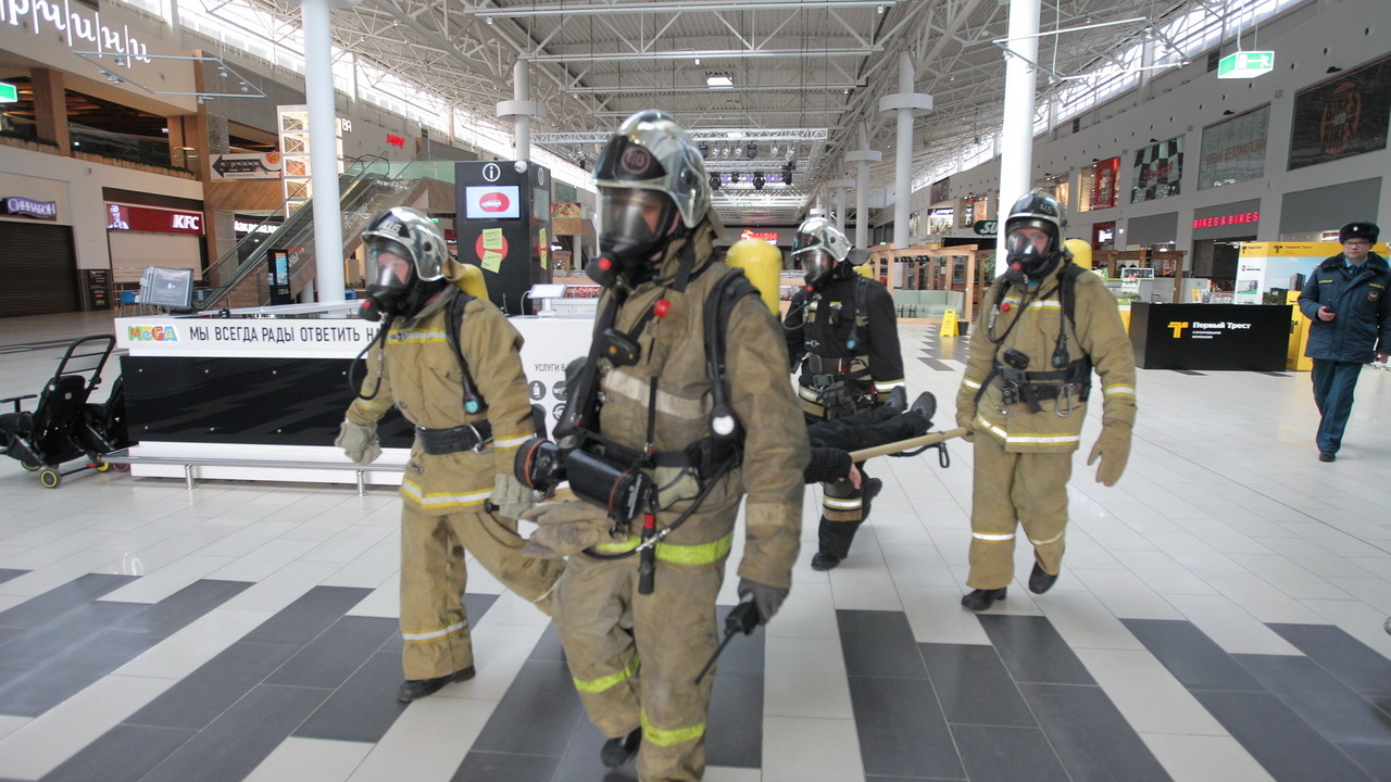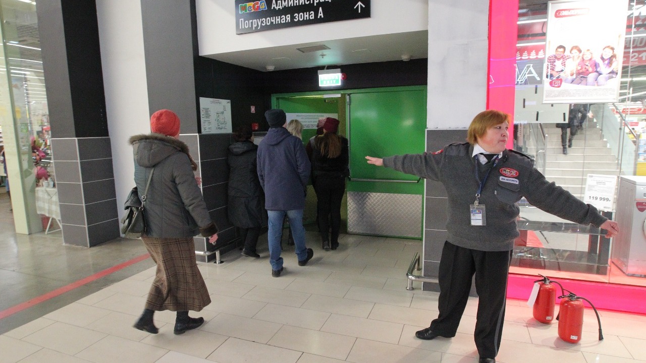 «У нас по периметру здания находятся 50 аварийных выходов на фасад здания, — прокомментировал управляющий торговым центром «Мега» Михаил Зверев. — Каждая дверь эвакуационного выхода оснащена системой «Push bar» (паник-балка) для беспрепятственного выхода людей при эвакуации. Эти двери всегда находятся в разблокированном состоянии. Через них в любое время можно покинуть территорию ТЦ. Пожарная сигнализация работает в автоматическом режиме, пожарные извещатели установлены во всех помещениях торгового центра. Система оповещения запускается автоматически от системы пожарной сигнализации. 1 265 огнетушителей расположены по всему зданию. Кроме того, в торговом центре функционируют 12 тысяч сенсорных датчиков, которые определяют возможный источник возгорания — фактически каждый квадратный метр находится под наблюдением. Весь ТЦ эвакуируется менее чем за 15 минут. Два раза в год у нас проводятся плановые эвакуации, одна из них проводится с участием посетителей, как сегодня, одна без, для того, чтобы сотрудники торгового центра, все сотрудники каждого магазина смогли отработать свои навыки поведения при эвакуации».