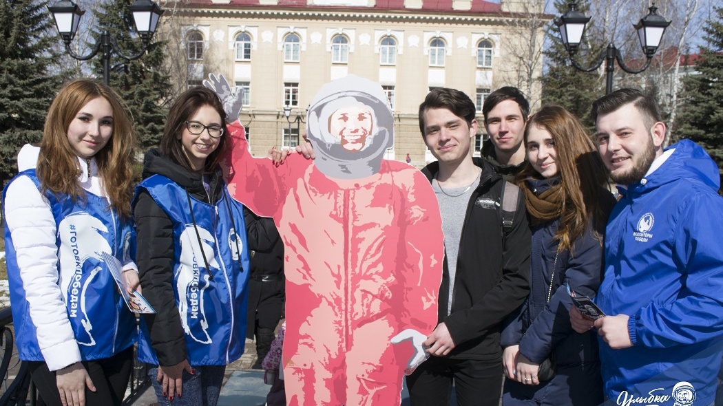 УФА, 12 апр 2018. /ИА «Башинформ», Гульфия Акулова/. Сегодня, в День космонавтики, активисты региональной организации общественного движения «Волонтеры Победы» вышли на улицы города Октябрьского в Башкирии с целью сохранения исторической памяти и формирования чувства гордости за свою страну. В рамках всероссийской акции «Улыбка Гагарина» они предлагали прохожим сфотографироваться с Юрием Гагариным и раздавали листовки о современных космонавтах страны.