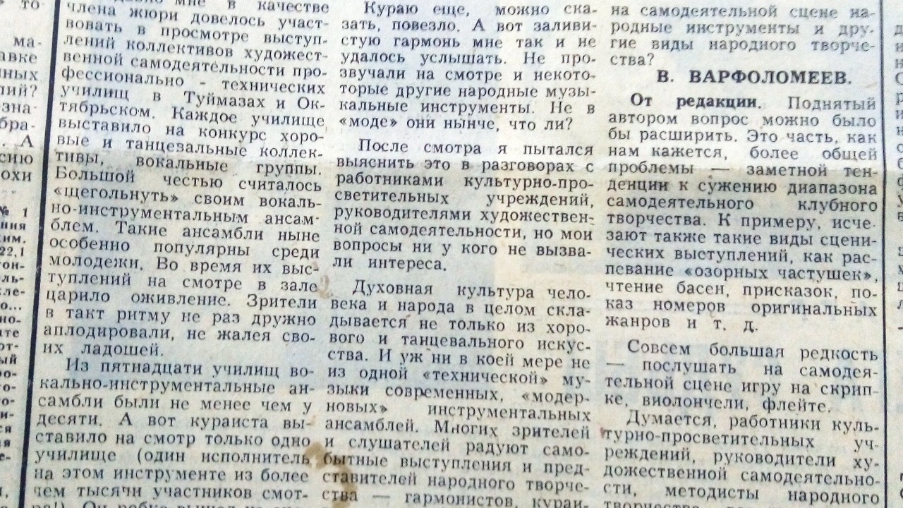 «Недавно мне в качестве члена жюри довелось участвовать в просмотре выступлений коллективов художественной самодеятельности профтехучилищ, - обратился в газету читатель. - Из пятнадцати училищ вокально-инструментальные ансамбли были не менее чем у десяти. А вот кураиста выставило на смотр только одно училище», - посетовал он. Выходило, что на тысячу участников смотра был всего лишь один кураист! И то «он робко вышел на сцену, бочком встал к зрителям, наспех исполнил свой номер и убежал за кулисы», отмечается в газете. Почему-то на смотре большой честью считалось «щегольнуть» именно своим ВИА.