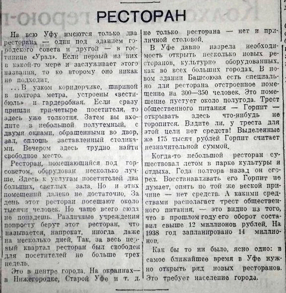 Такая картина наблюдалась в центре города. На окраинах - в Нижегородке, Старой Уфе не только ресторана, даже приличной столовой нет, отмечается в публикации. В издании считают, что «в Уфе давно назрела необходимость открыть несколько новых ресторанов, культурно оборудованных, как во всех больших городах». В новом здании Башсоюза имелось для этого и специально построенное помещение на 350 человек. Однако трест общественного питания - Горпит - не торопился открывать там ресторан, ссылаясь на отсутствие денег. Выделенные на это 175 тысяч рублей Горпит считал незначительной суммой. При этом, как выяснили в газете, в 1937 году оборот средств в тресте общепита составил свыше 12 млн рублей, а на 1938 год было запланировано и того больше - 14 млн рублей.