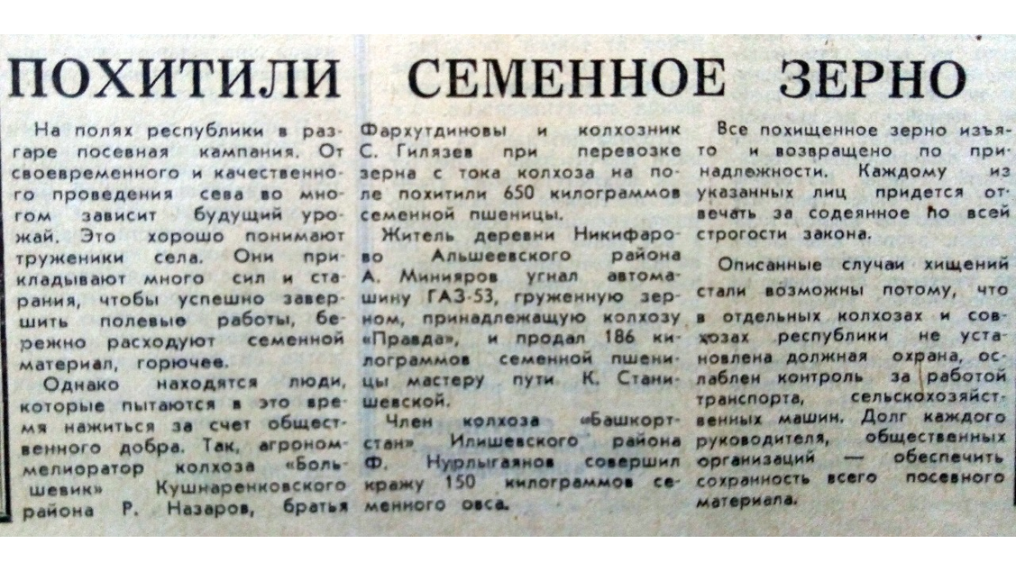 «Агроном-мелиоратор колхоза «Большевик» Кушнаренковского района Р. Назаров, братья Фархутдиновы и колхозник С. Гилязев при перевозке зерна с тока колхоза на поле похитили 650 килограммов семенной пшеницы», - рассказали изданию в МВД БАССР. Житель деревни Никифарово Альшеевского района угнал колхозную автомашину ГАЗ-53, груженную зерном, и продал почти 200 килограммов семенной пшеницы мастеру пути. В криминальную сводку попал и сельчанин из колхоза «Башкортостан» Илишевского района, совершивший кражу 150 килограммов семенного овса.