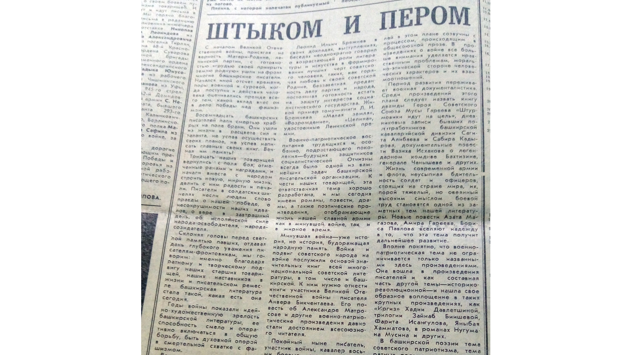 Война и подвиг советского народа на войне послужили основой значительных книг всей многонациональной литературы страны. «К ним нужно отнести книги участника Великой Отечественной войны писателя Анвера Бикчентаева. Его повесть об Александре Матросове и другие военно-патриотические произведения давно стали достоянием всесоюзного читателя», - говорится в газете. Участник войны, кавалер восьми боевых орденов Денис Исламов обогатил библиотеку военной книги своим романом «Дорога Москвы», в котором «глубоко и правдиво показал истоки массового героизма советских воинов».
