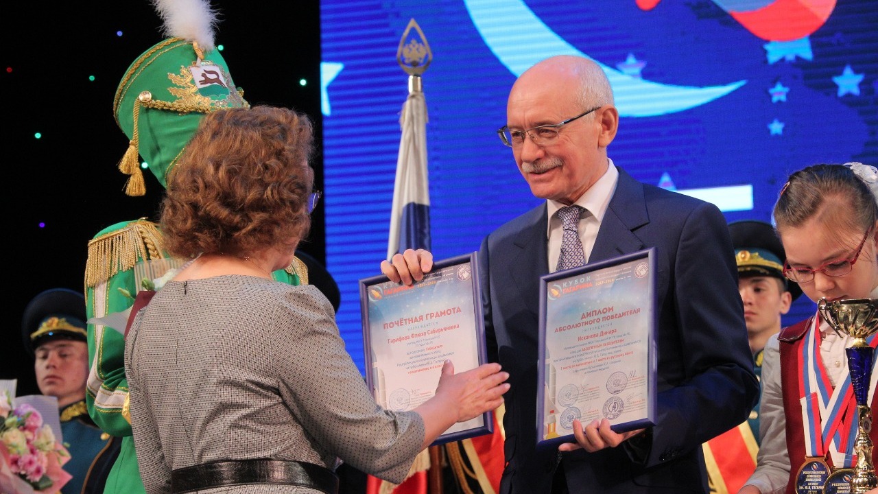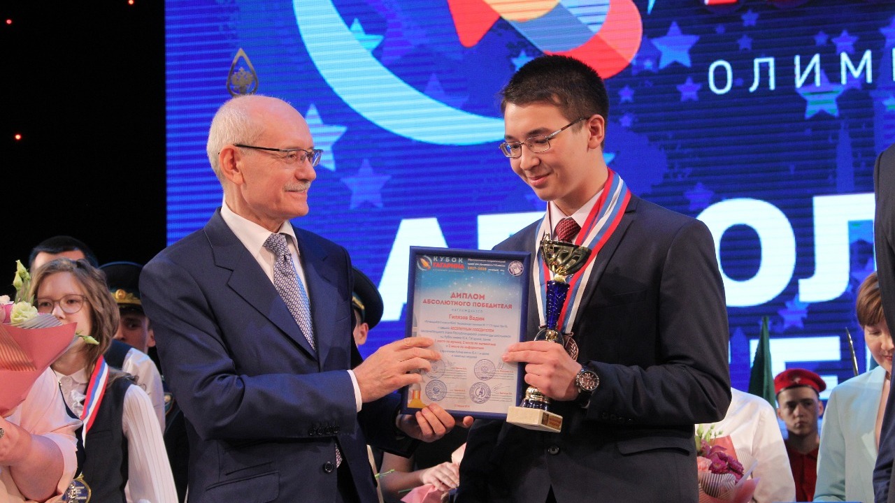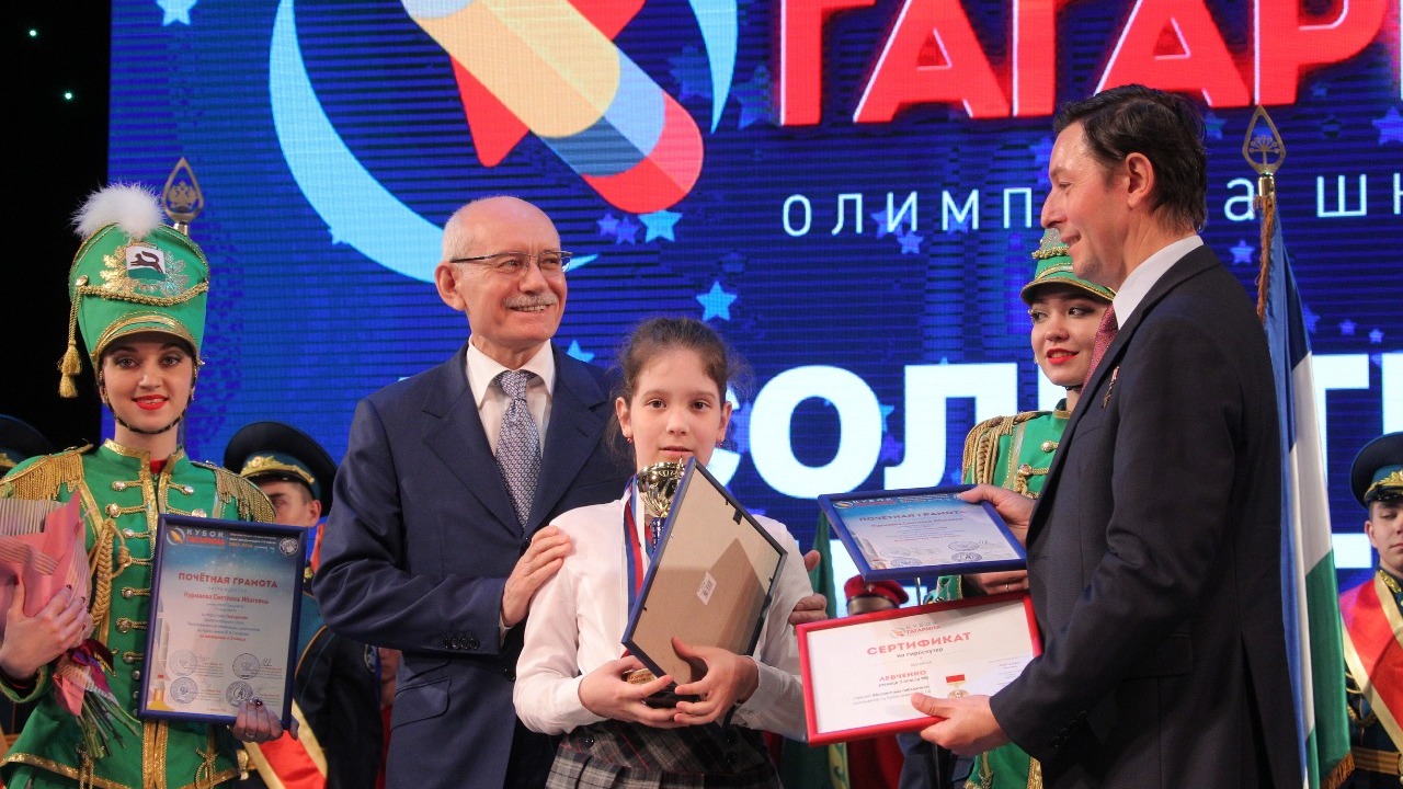 – В олимпиаде участвовали более 120 тысяч школьников. Всего у нас в республике в школах учится 450-460 тысяч ребят. Значит, более чем четвёртая часть школьников, обучающихся в наших школах, участвовала в этой олимпиаде. Это замечательный успех, замечательные цифры, – сказал Рустэм Хамитов. – Кубок, который вы сегодня получаете, неспроста носит имя Юрия Алексеевича Гагарина. Безусловно, его имя связывается прежде всего с прорывом в космос – на территорию новых знаний, новых возможностей человека. Этот пример для вас должен быть очень важным.