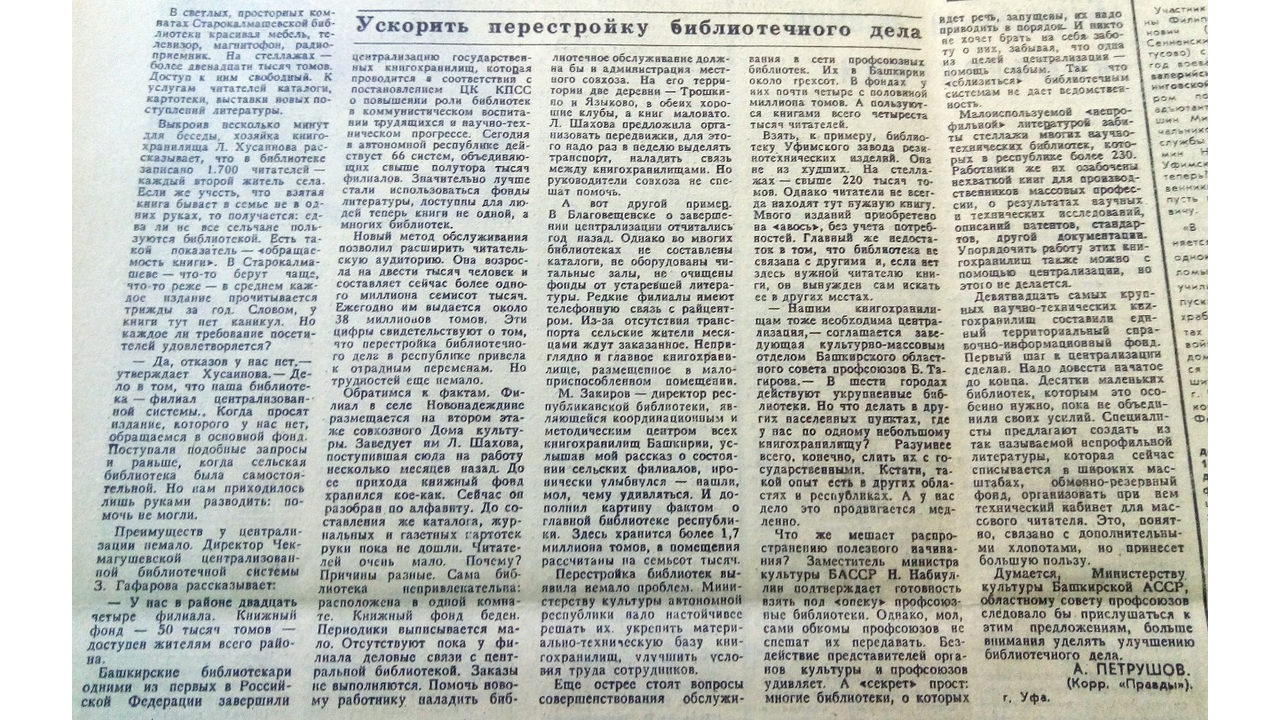 В газете отмечается, что башкирские библиотекари одними из первых в РСФСР завершили централизацию государственных книгохранилищ. «Сегодня в автономной республике действует 66 систем, объединяющих свыше полутора тысяч филиалов». В итоге жителям республики стали доступны книги не одной, а сразу многих библиотек.