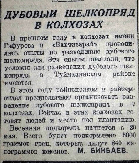 «В прошлом году в колхозах имени Гафурова и «Бахчисарай» проводились опыты по разведению дубового шелкопряда», - информировала газета 5 мая 1938 года. В итоге опыты показали, что условия для разведения дубового шелкопряда в Туймазинском районе республики имеются.