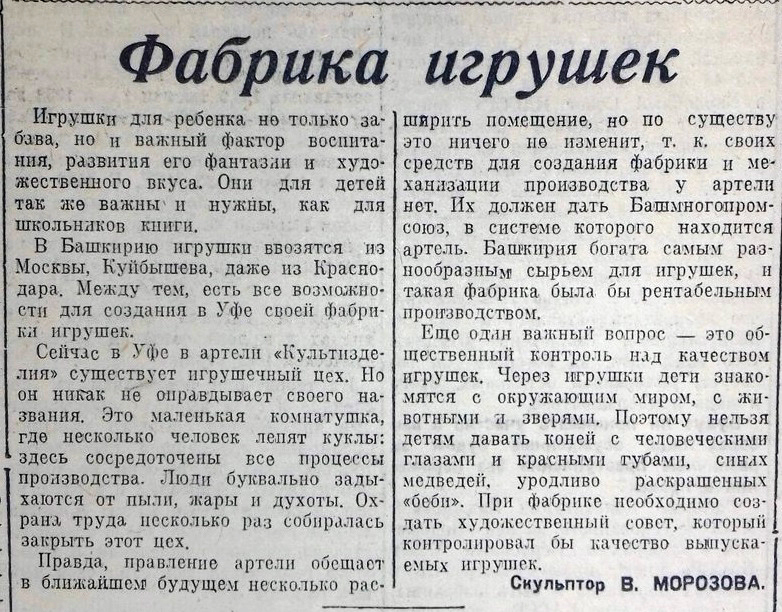 «Сейчас в Уфе в артели «Культизделия» существует игрушечный цех, - говорится в публикации, - но он никак не оправдывает своего названия». Это была маленькая комнатка, в которой несколько человек лепили куклы, задыхаясь от пыли и духоты. Денег для расширения помещения и создания фабрики у артели не имелось. Все надежды на улучшения были связаны с «Башмногопромсоюзом», в системе которого находилась артель. В издании отмечается, что «Башкирия богата самым разнообразным сырьем для игрушек, и такая фабрика была бы рентабельным производством».