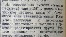 Не остались в стороне и современные советские писатели. В 1937 году вышла в башкирском переводе легендарная книга Николая Островского «Как закалялась сталь». В публикации отмечается, что «роман уже распродан и переиздается вновь; переведено и находится в процессе редактирования другое большое произведение писателя «Рожденные бурей».