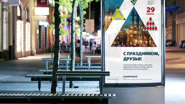 Бренд представляет собой пирамидку и аббревиатуру STR. «…Вдруг стало понятно, что в этом городе всё присутствует в тройном количестве - три реки, три горы в окрестностях, три крупных предприятия, вокруг которых сформировалось три микрорайона города, три вуза, три кинотеатра, три торговых центра, и так далее. Всю историю Стерлитамака можно уместить в три больших этапа: жизнь «купеческая», «химическая» и «человеческая». Даже герб города – это три белых гуся, плывущих по голубому полю…», — говорил на презентации бренда его разработчик